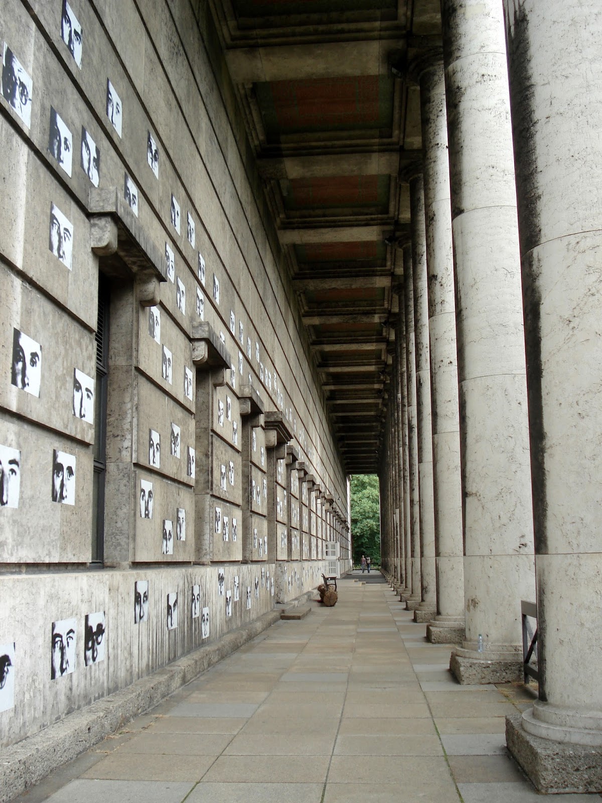 Скоро стигнах до Хаус дер Кунст. Фасадата на изложбената зала от юг, където е входа, има каменна облицовка и е обградена от тежка колонада. Не знам, каква е историята на тази сграда, но видът ѝ изглежда мрачен. По каменната облицовка бяха разлепени големи черно – бели снимки на детайли от различни човешки лица.